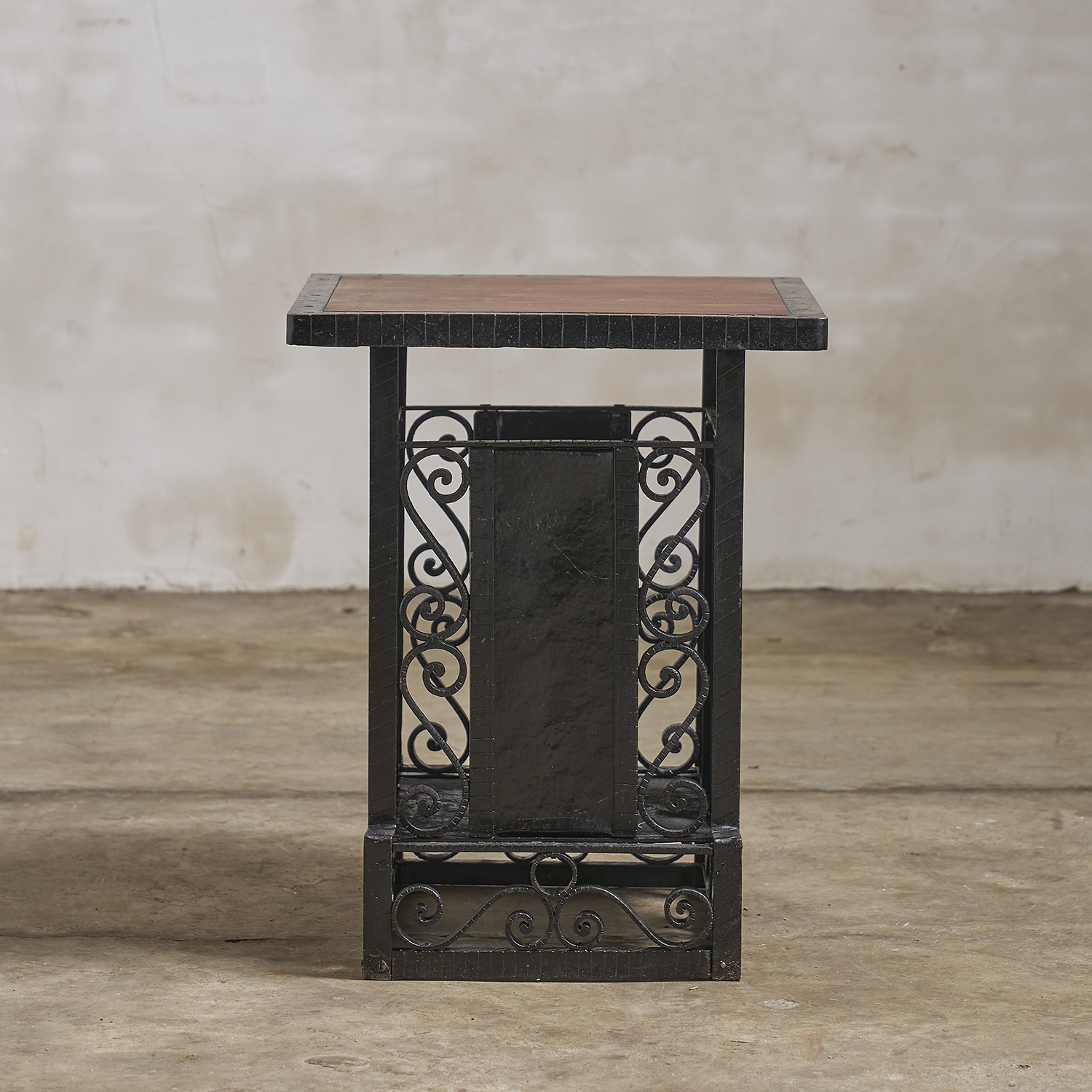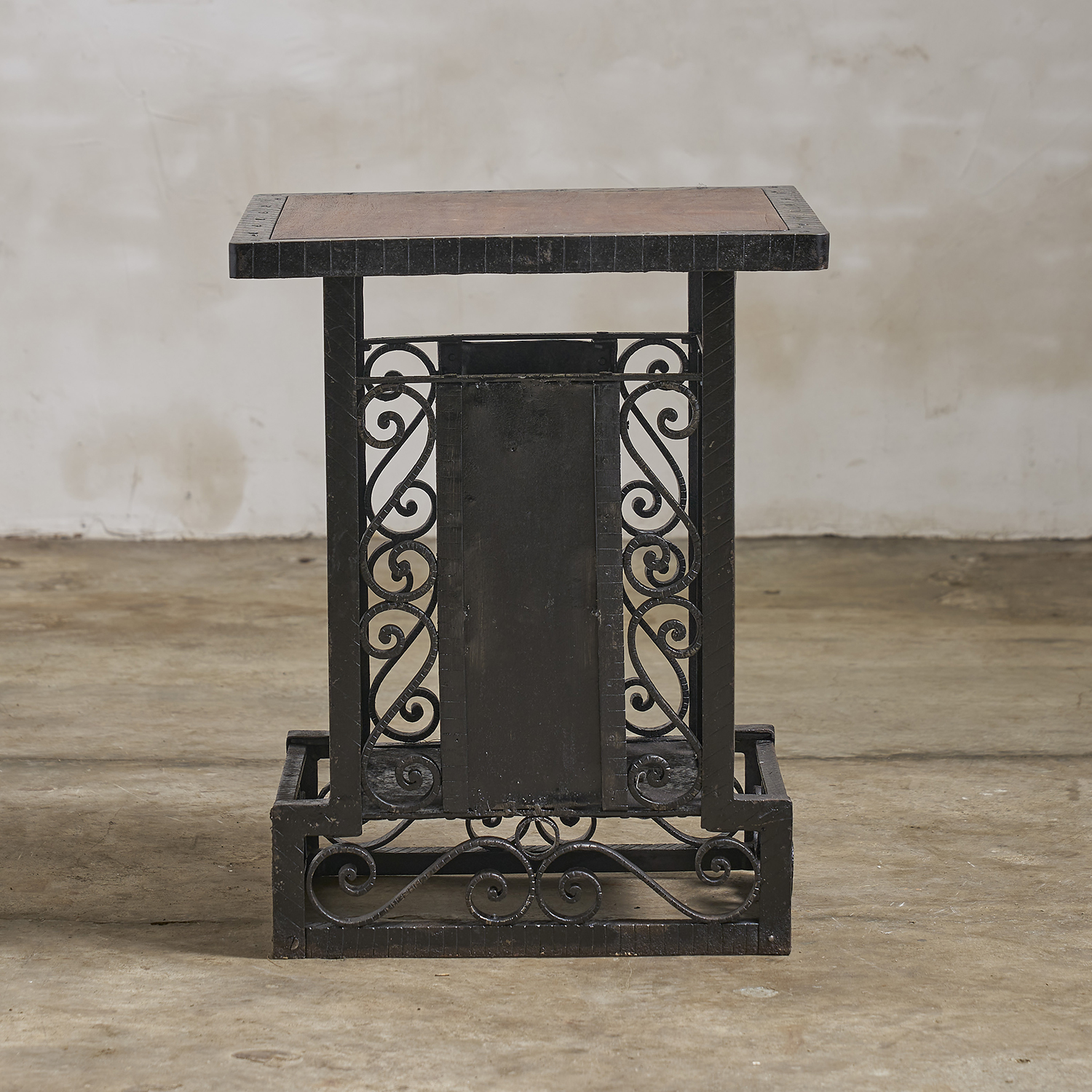 Guéridon de forme carrée, le plateau en bois repose sur une armature en fer battu à décor de volutes, vers 1930.