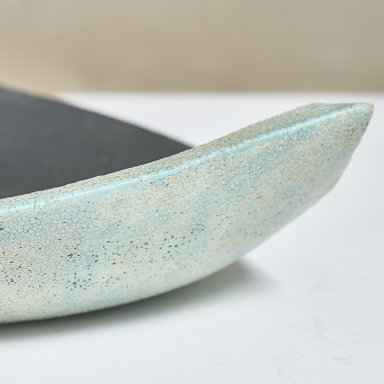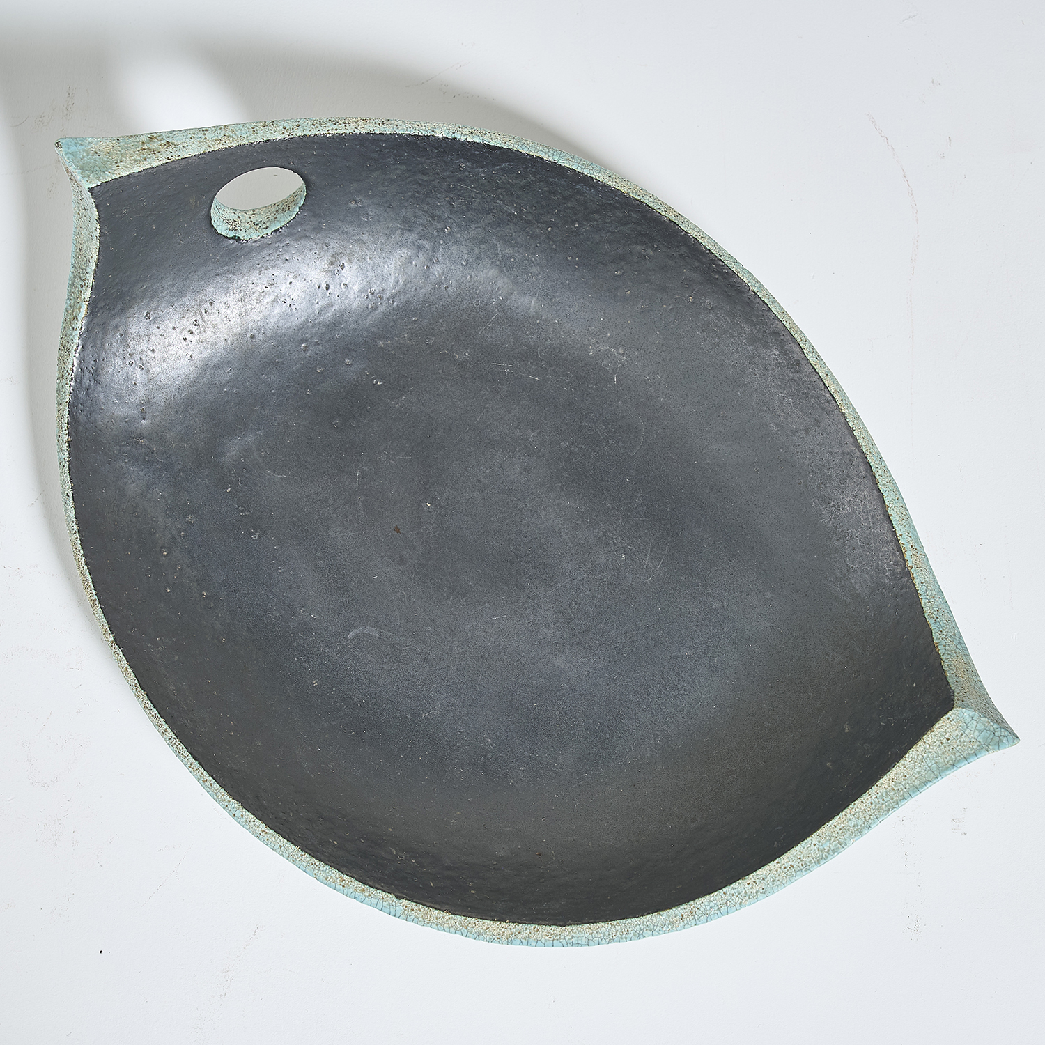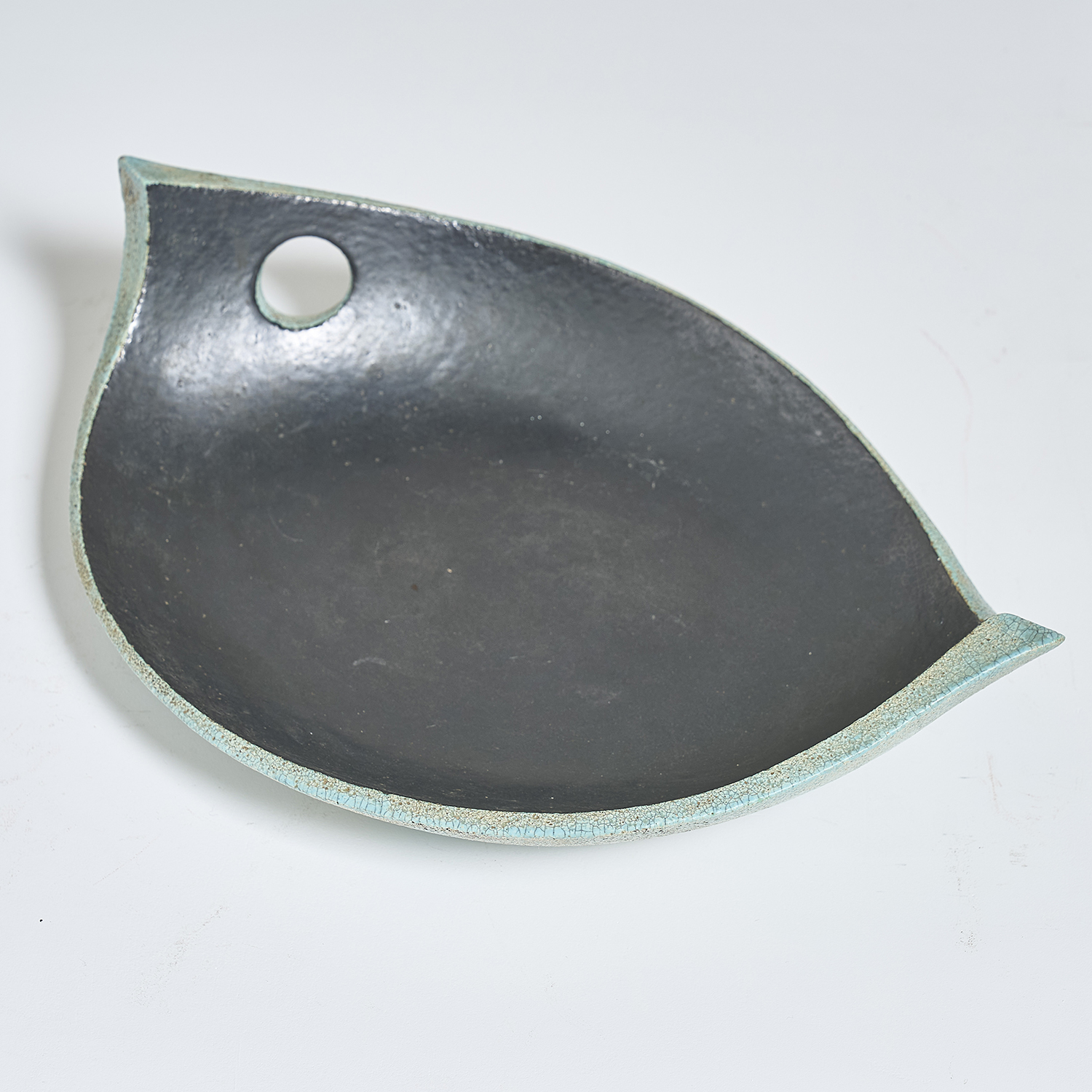 Grande coupe à décor de poisson stylisé en céramique émaillée turquoise et noire irisée.