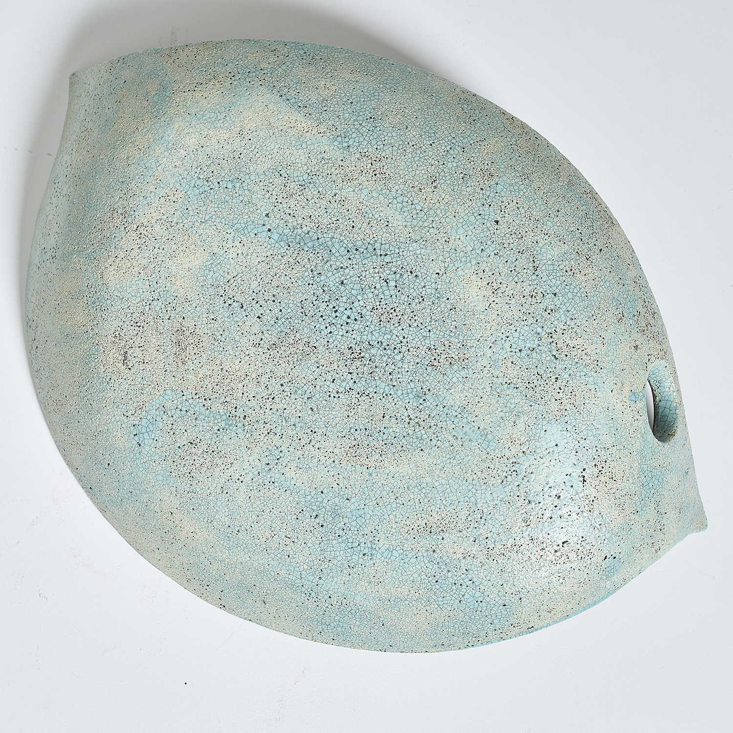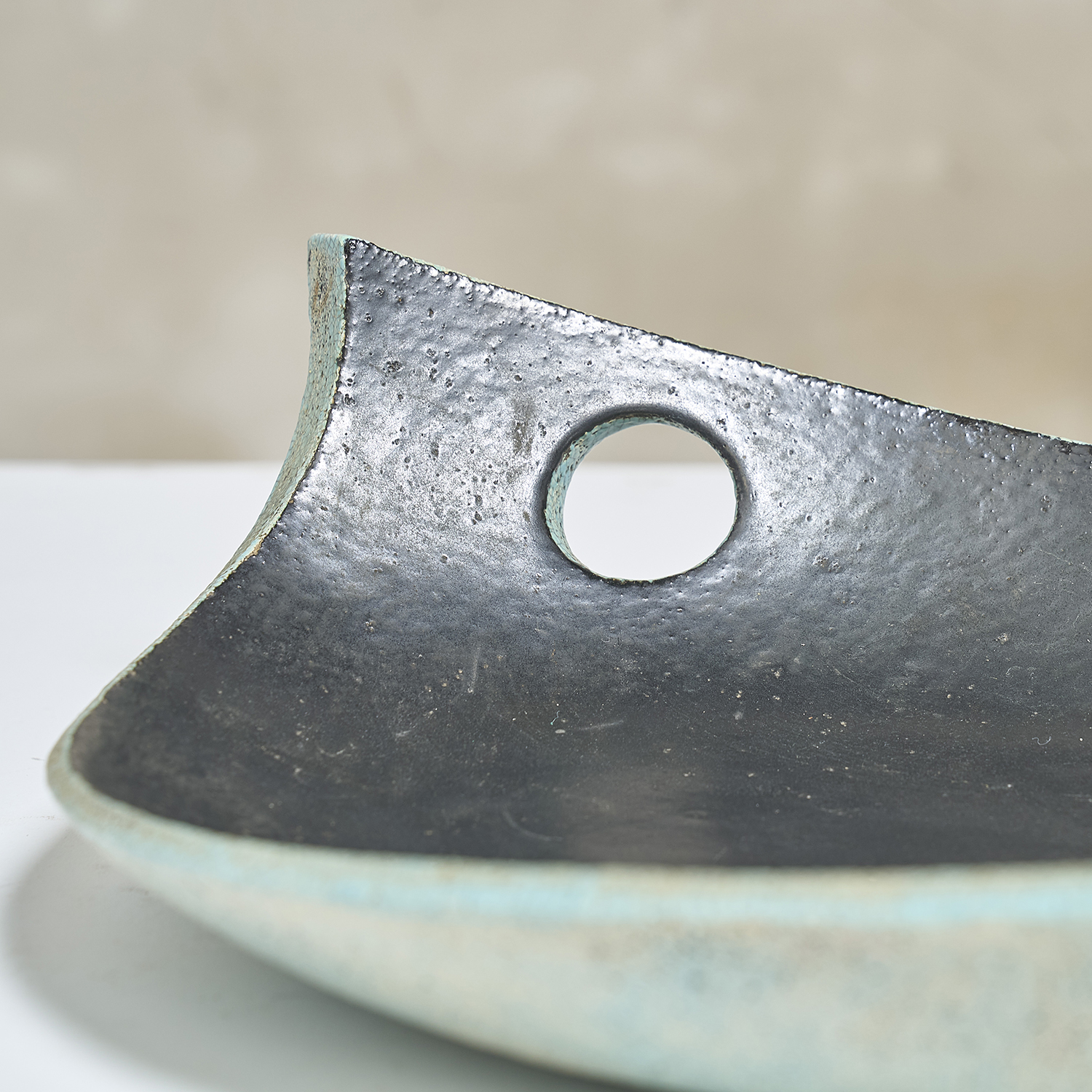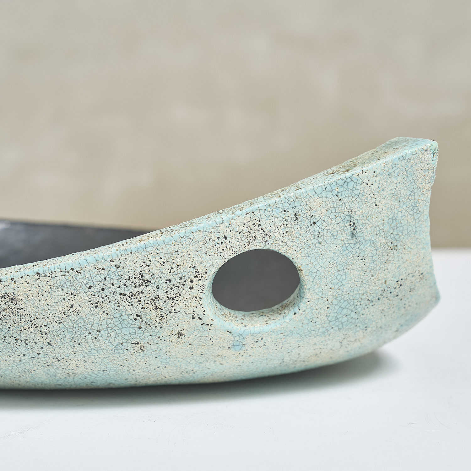 Grande coupe à décor de poisson stylisé en céramique émaillée turquoise et noire irisée.