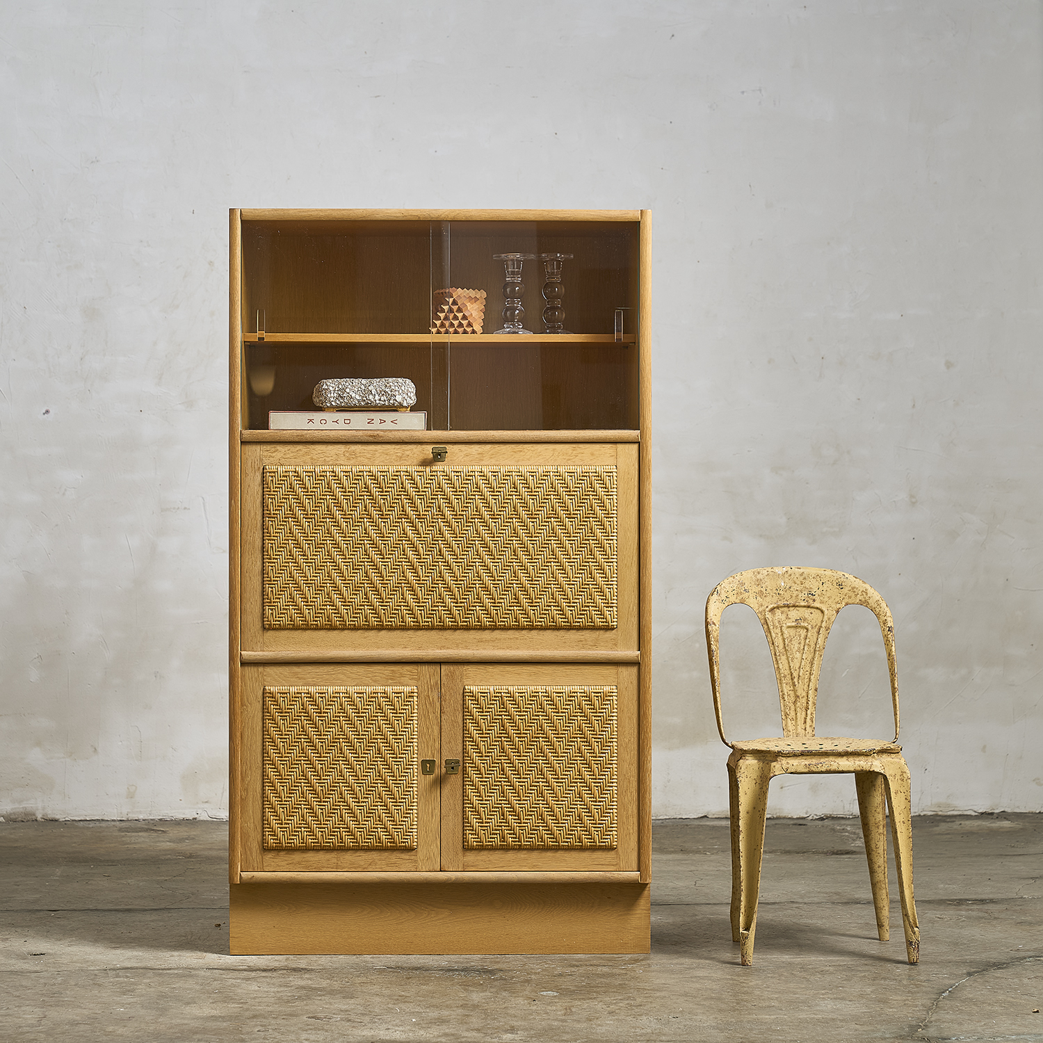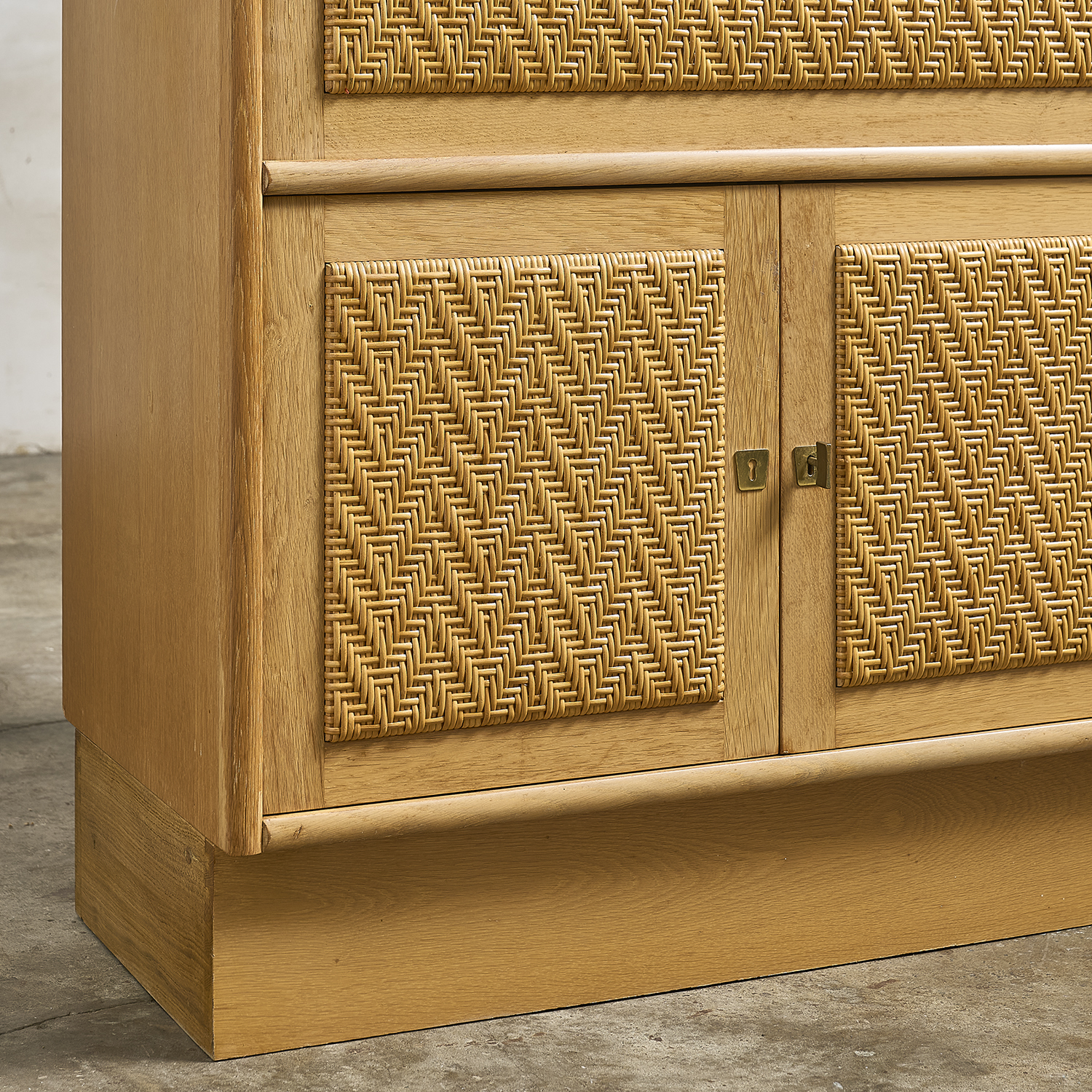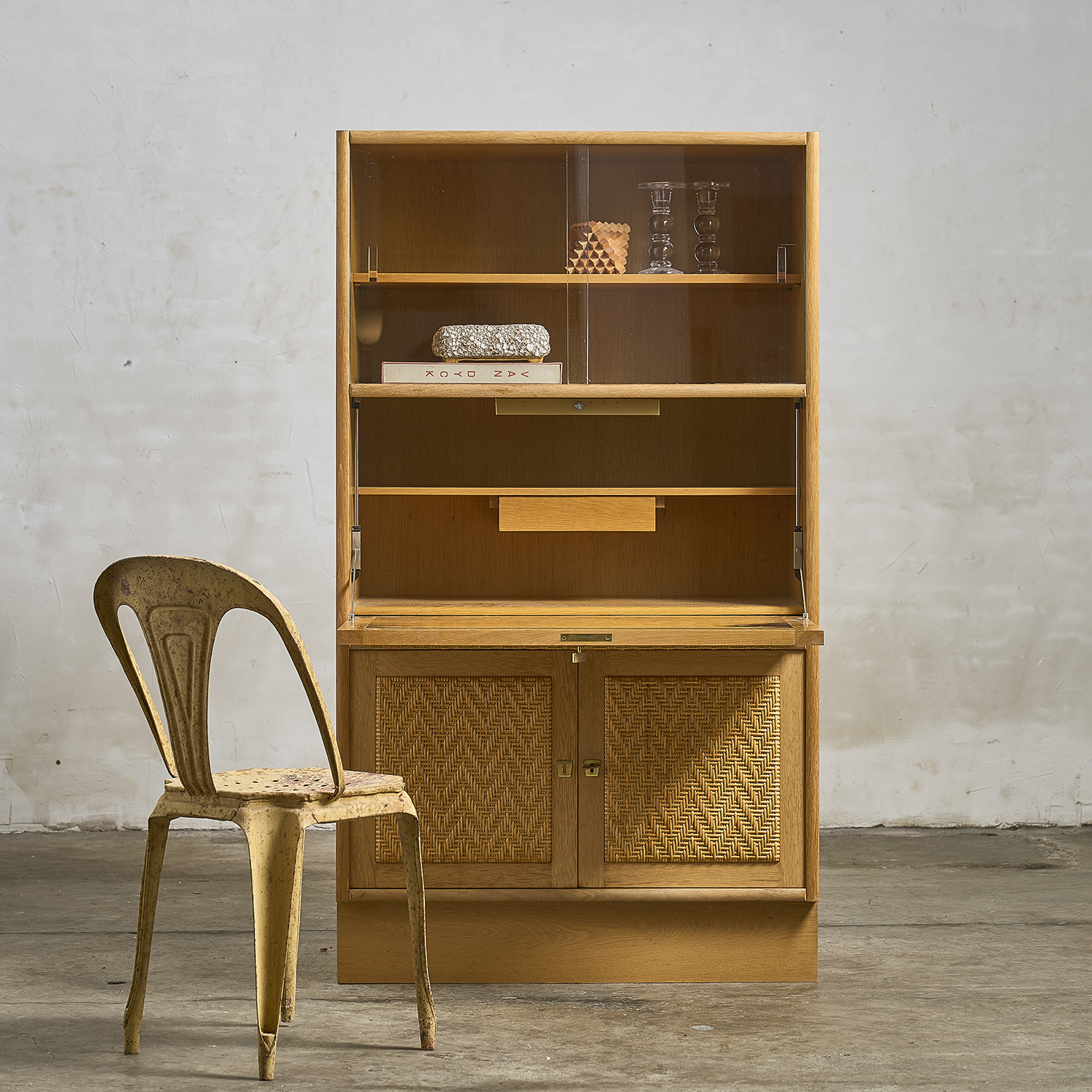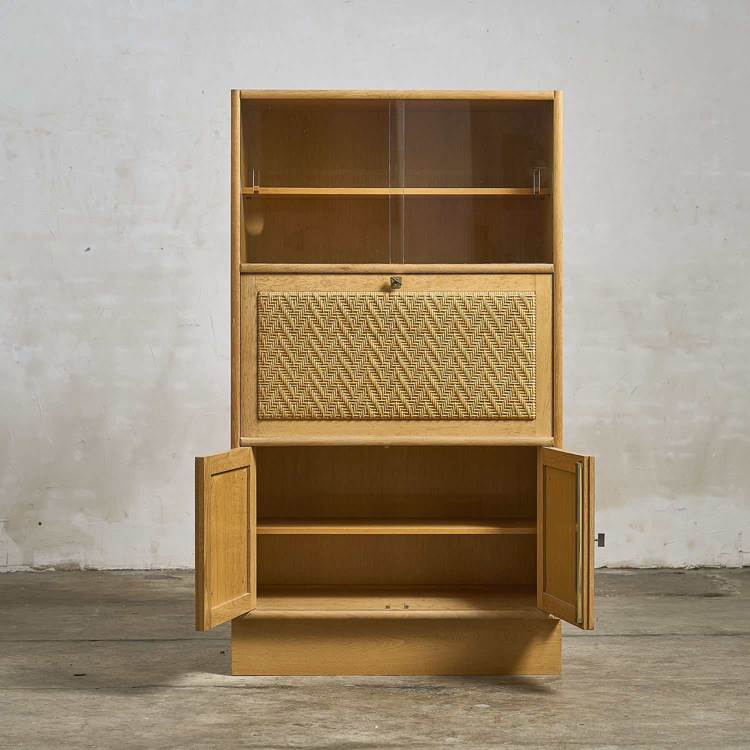 Armoire secrétaire en chêne ouvrant en partie haute par une niche vitrée, un abattant et deux vantaux recouverts de rotin tressé en facade en partie basse.