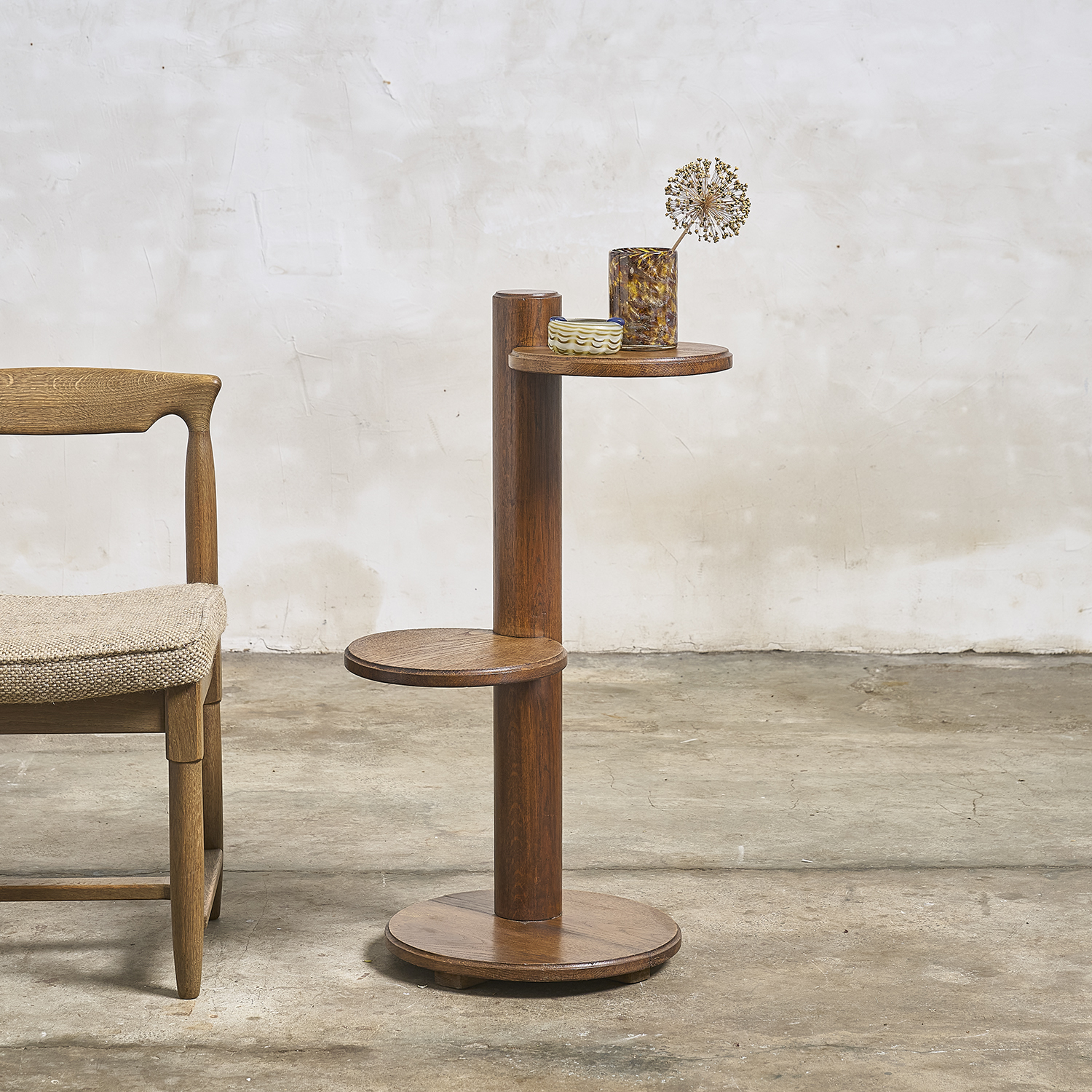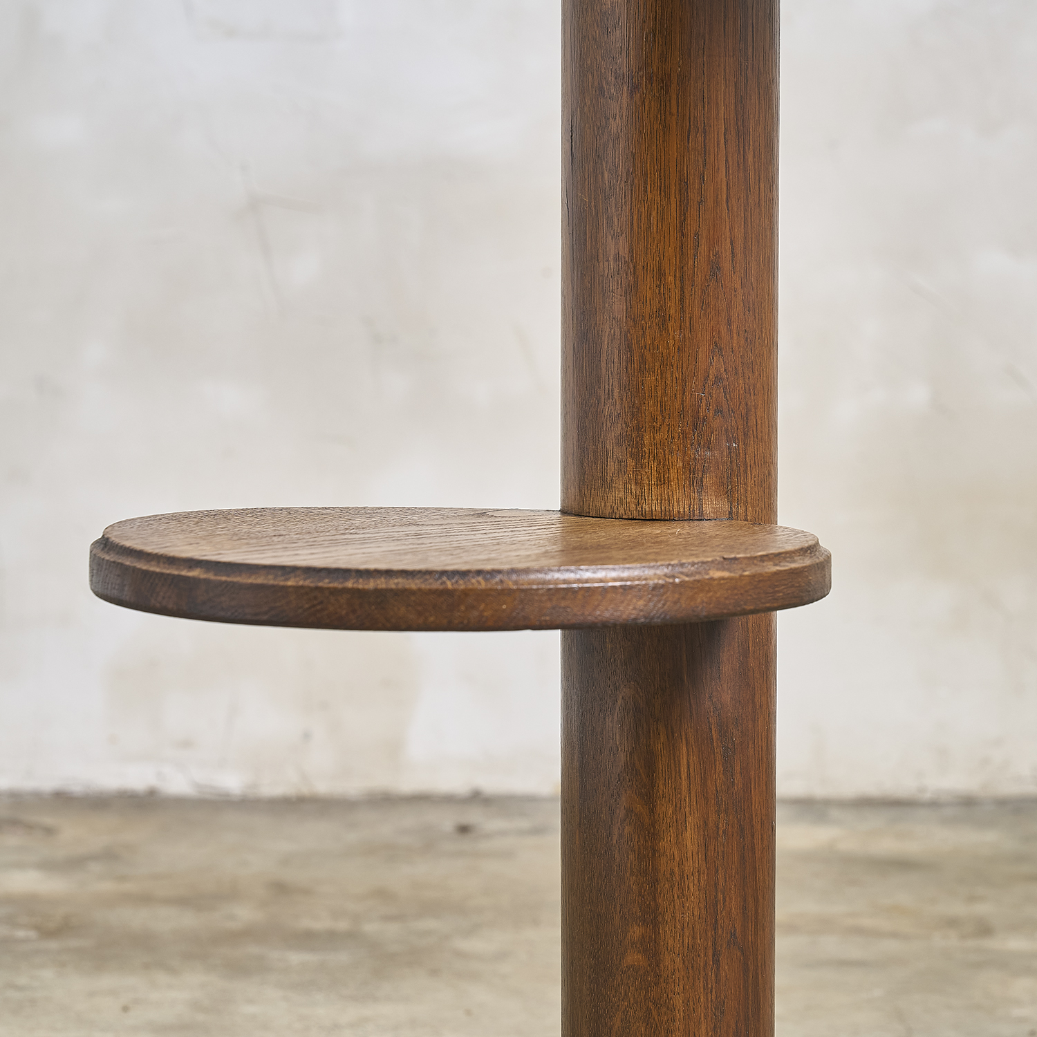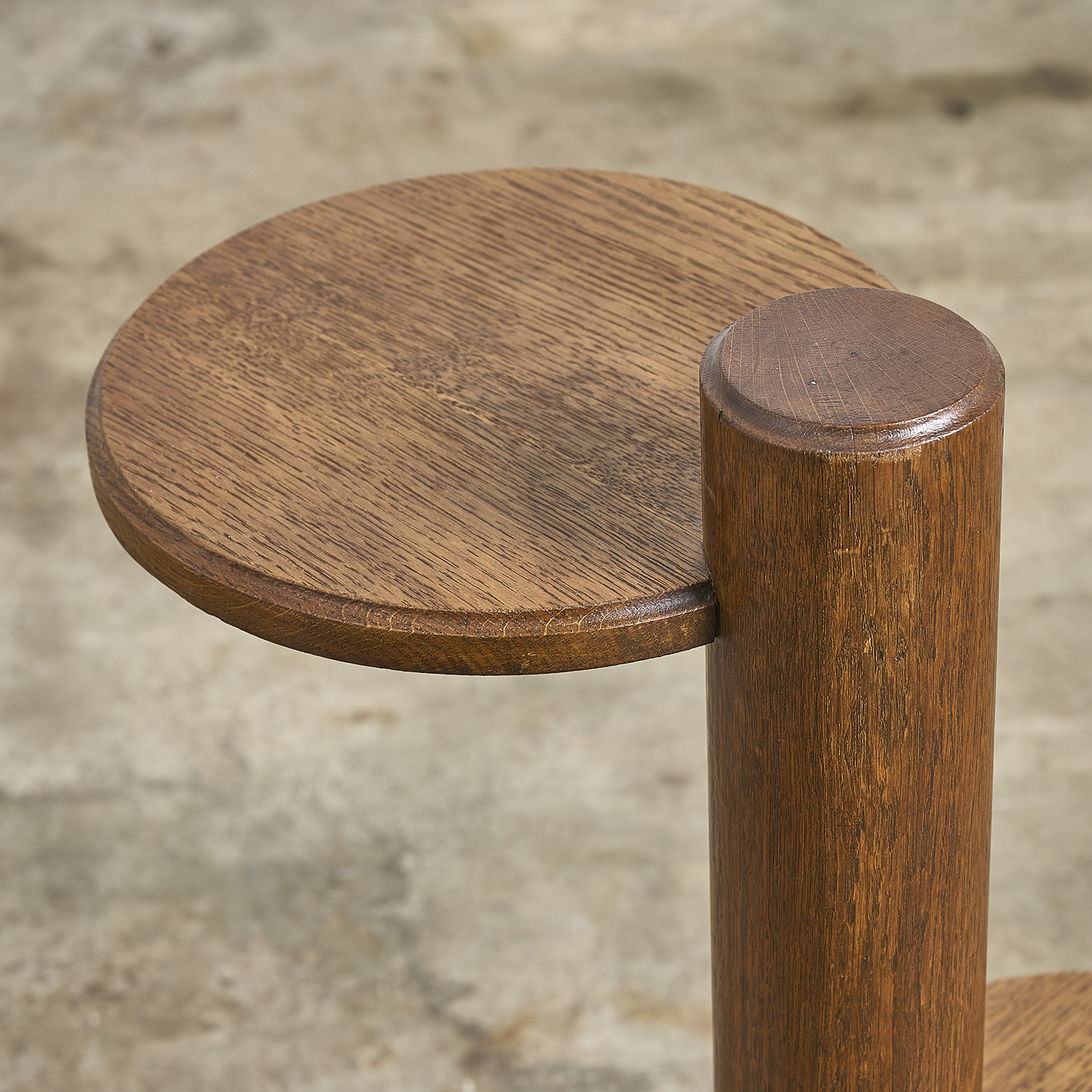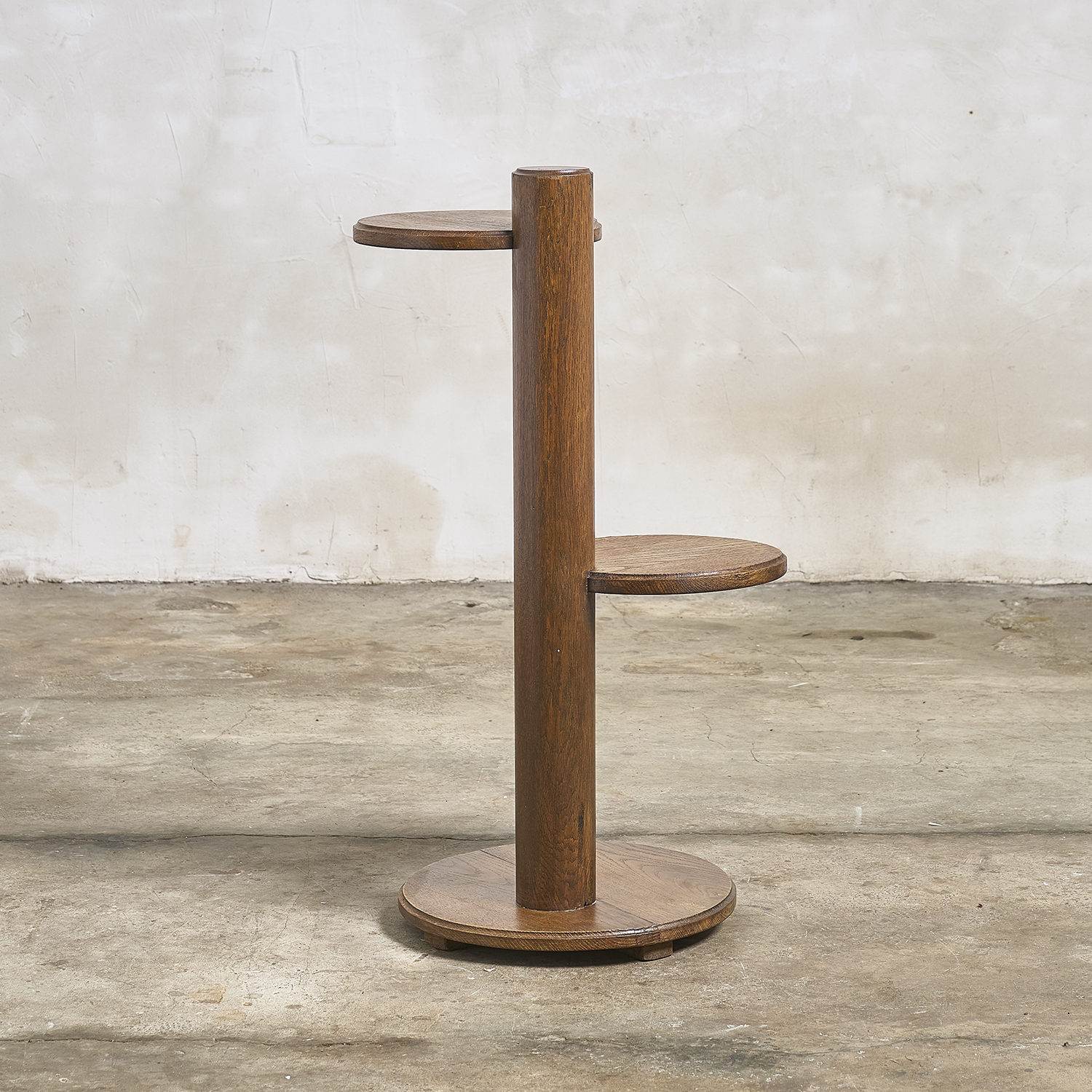 Sellette art déco en chêne à 2 plateaux circulaires, le fût de section ronde repose sur une base circulaire.