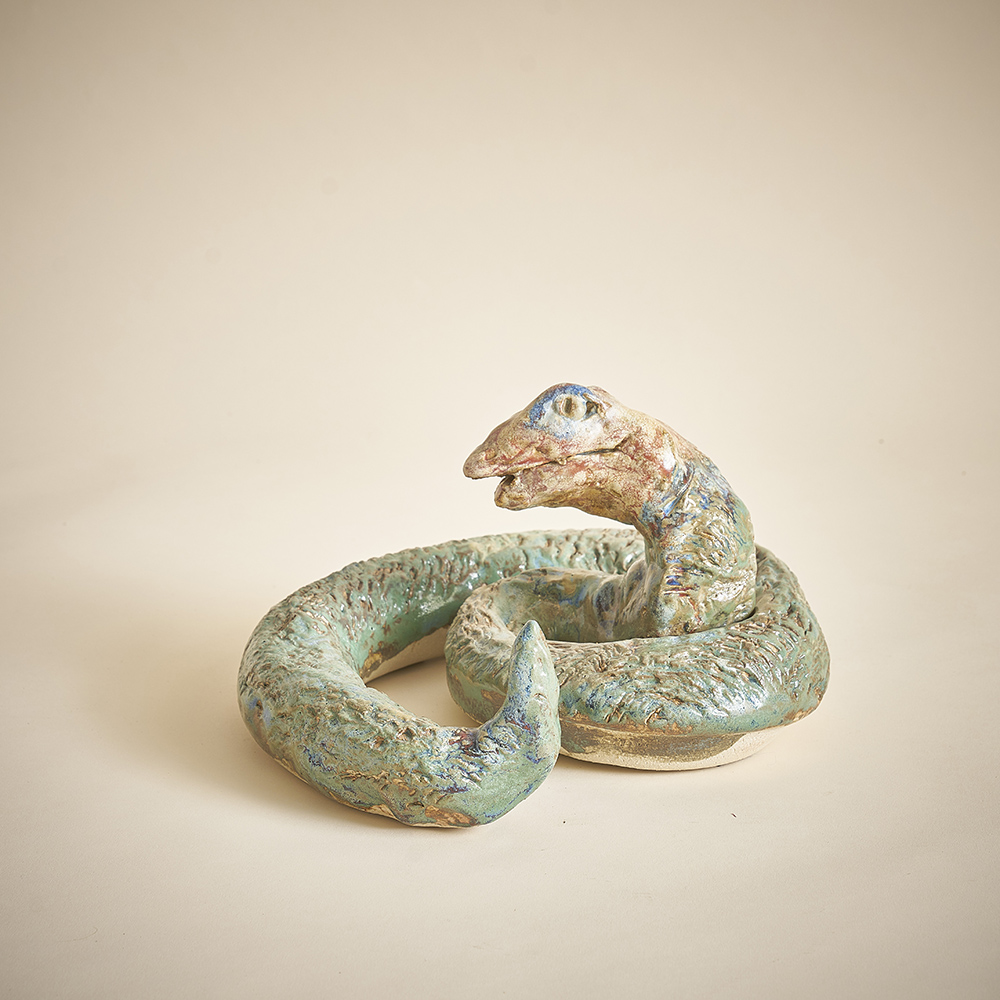 Serpent en céramique, beau travail d’art naïf. Jolies teintes et effet de matière. Hauteur: 16,5cm Diamètre: 27cm