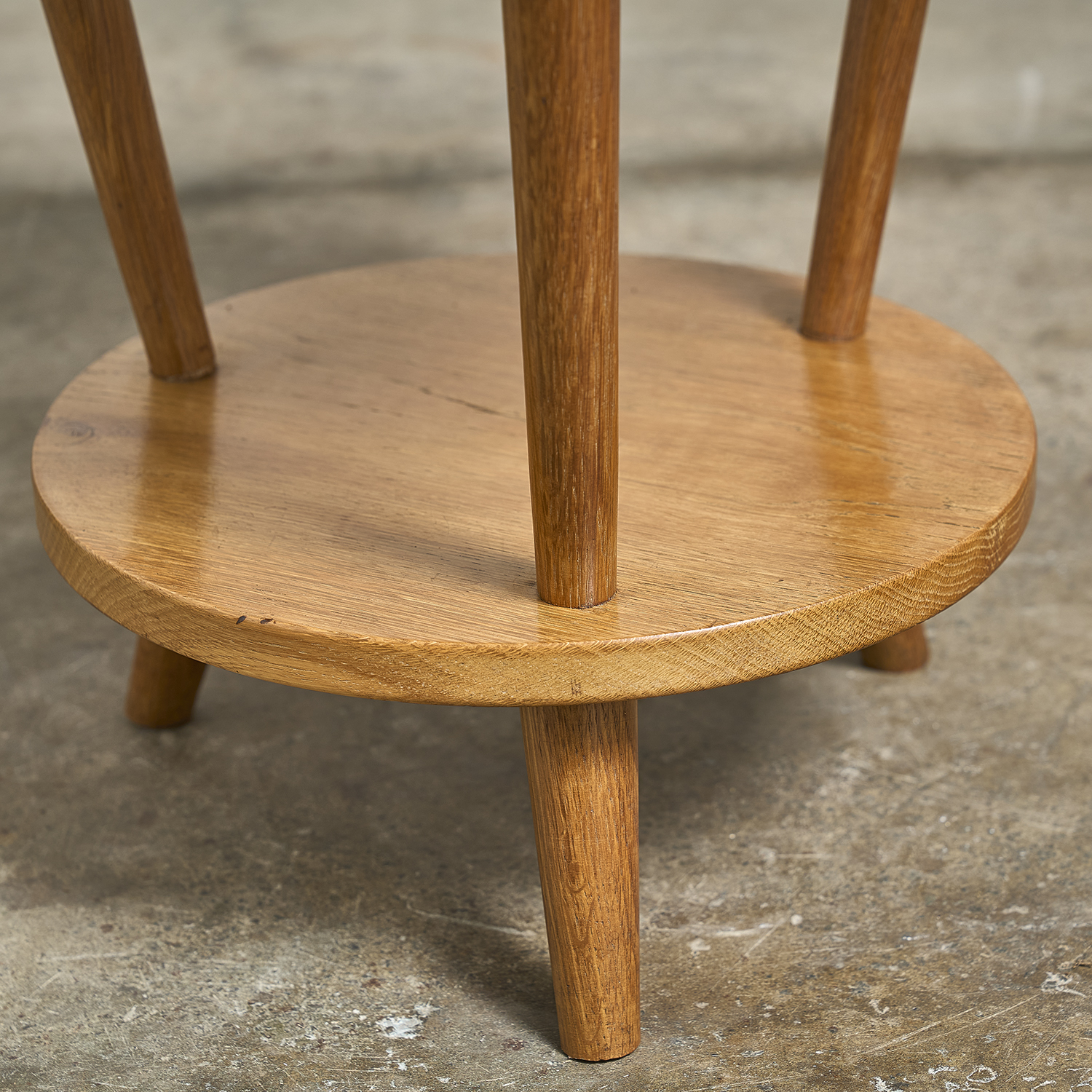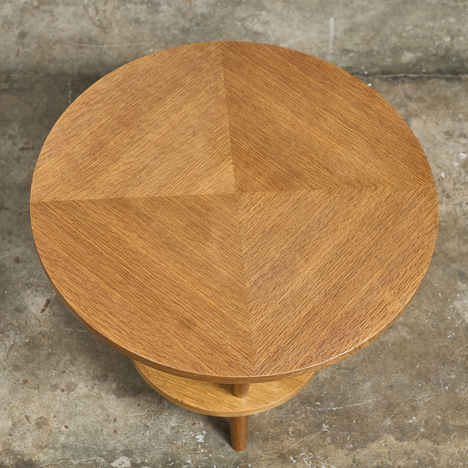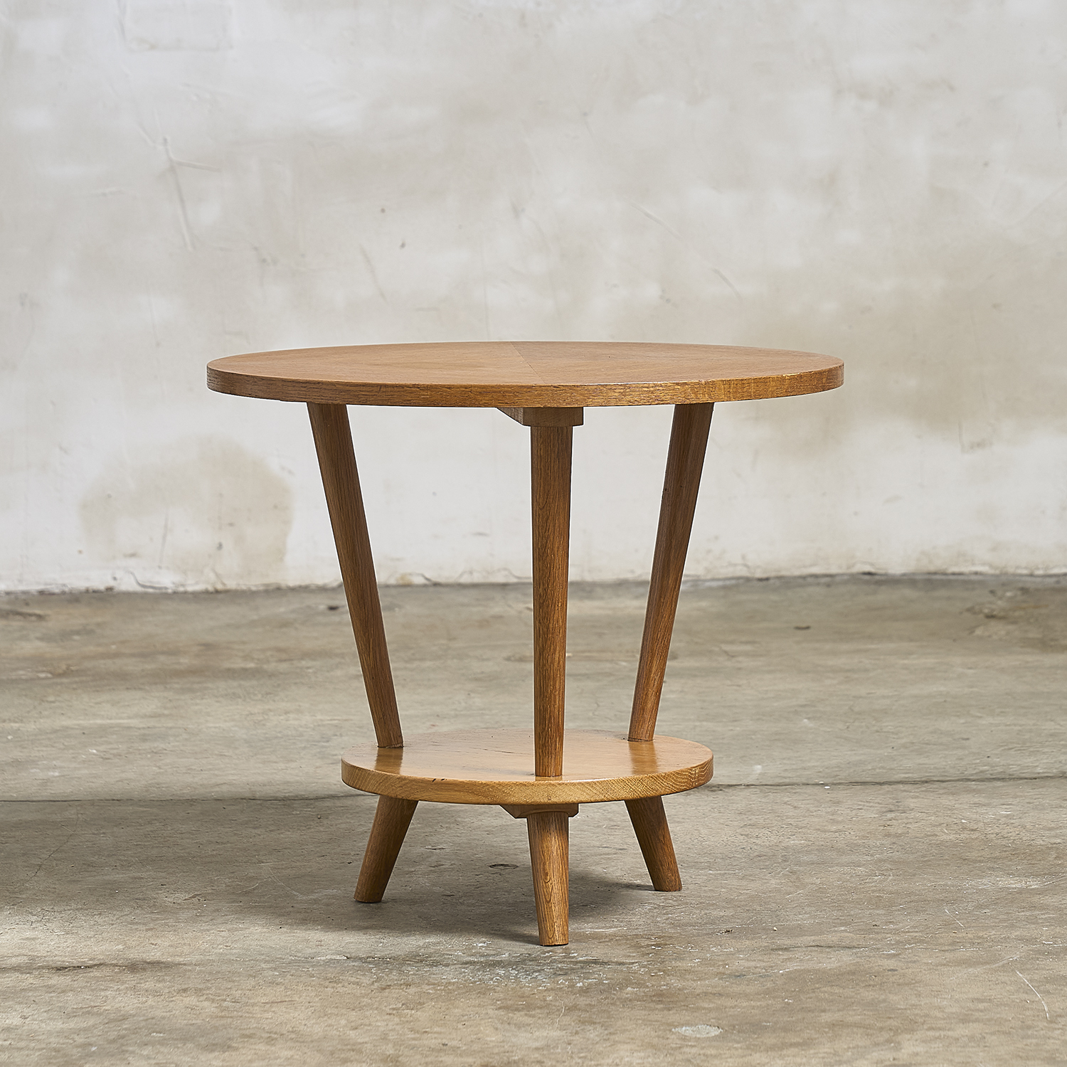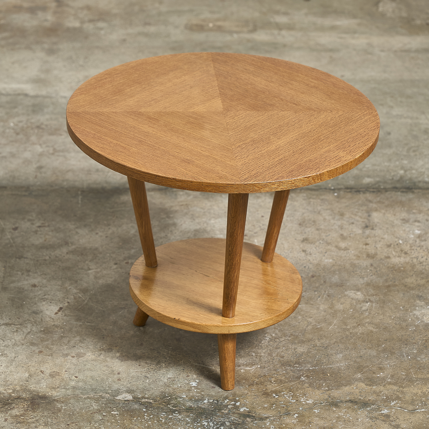 Guéridon en chêne et placage de chêne à plateaux circulaires.