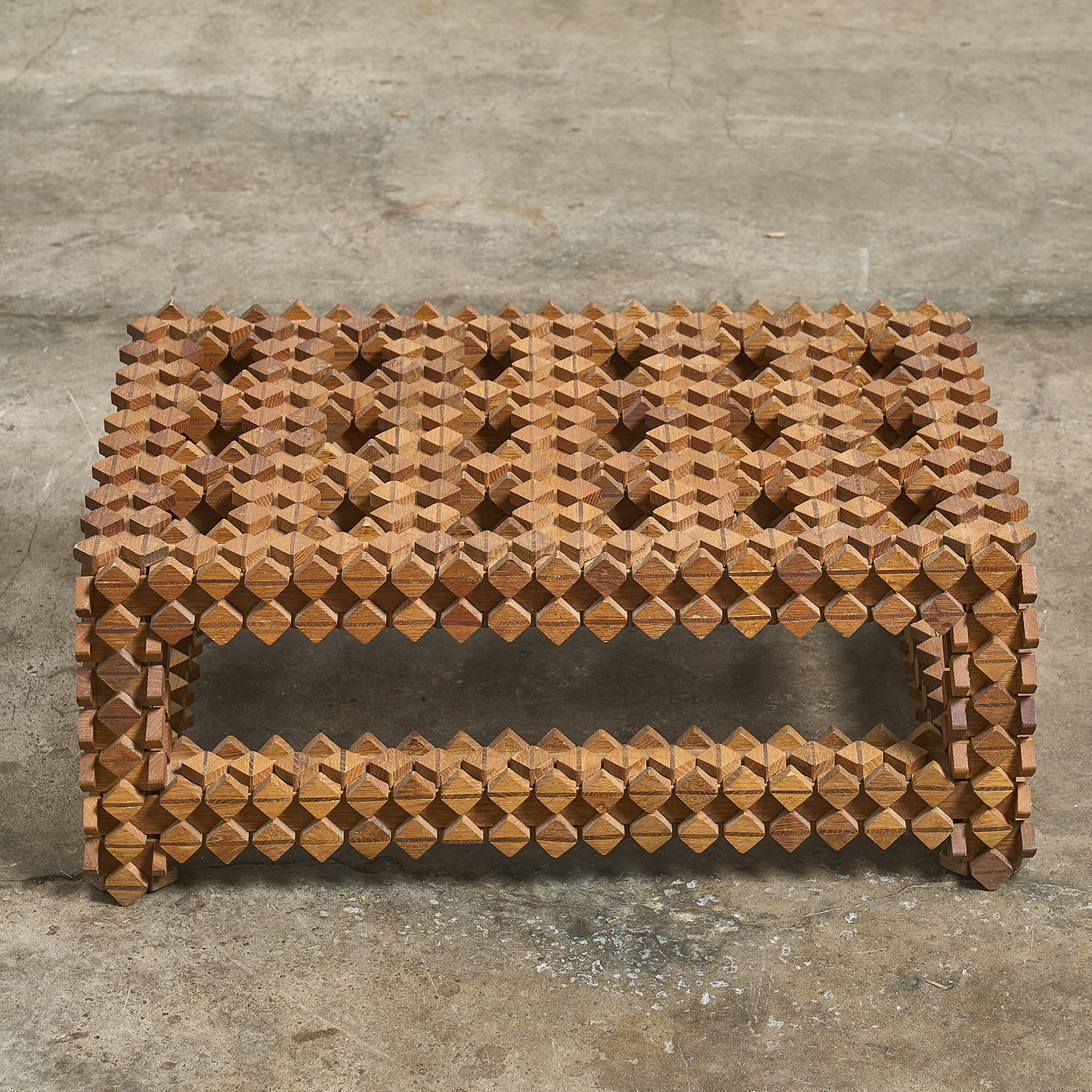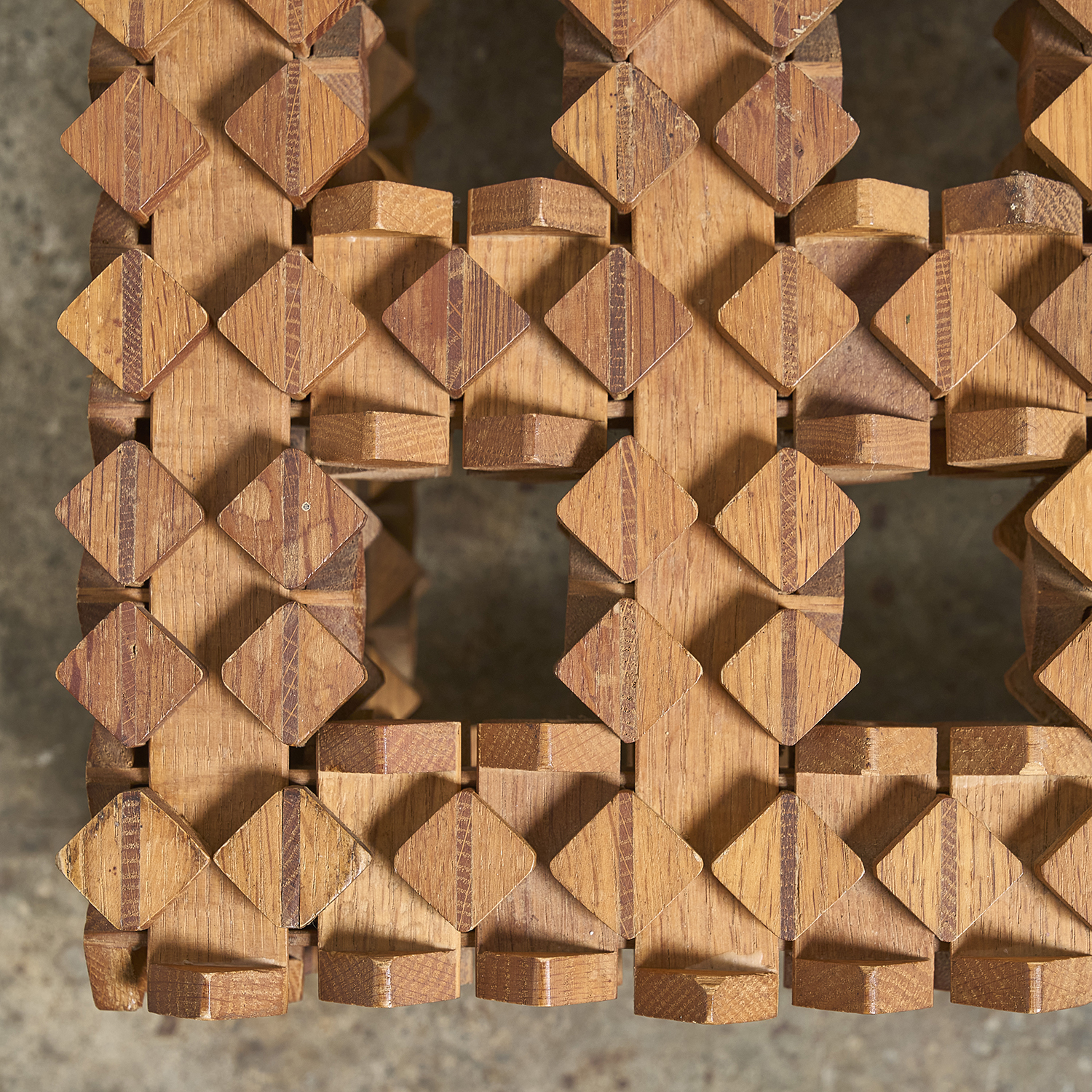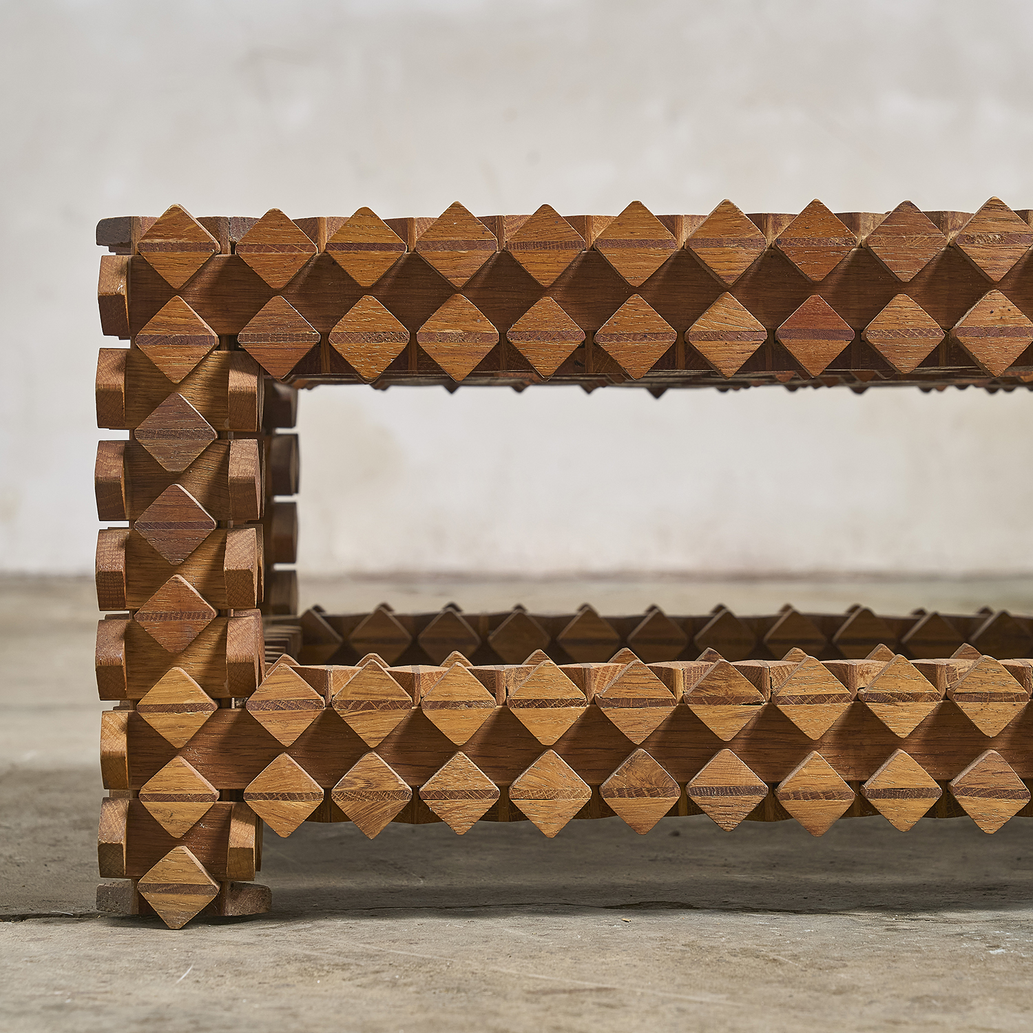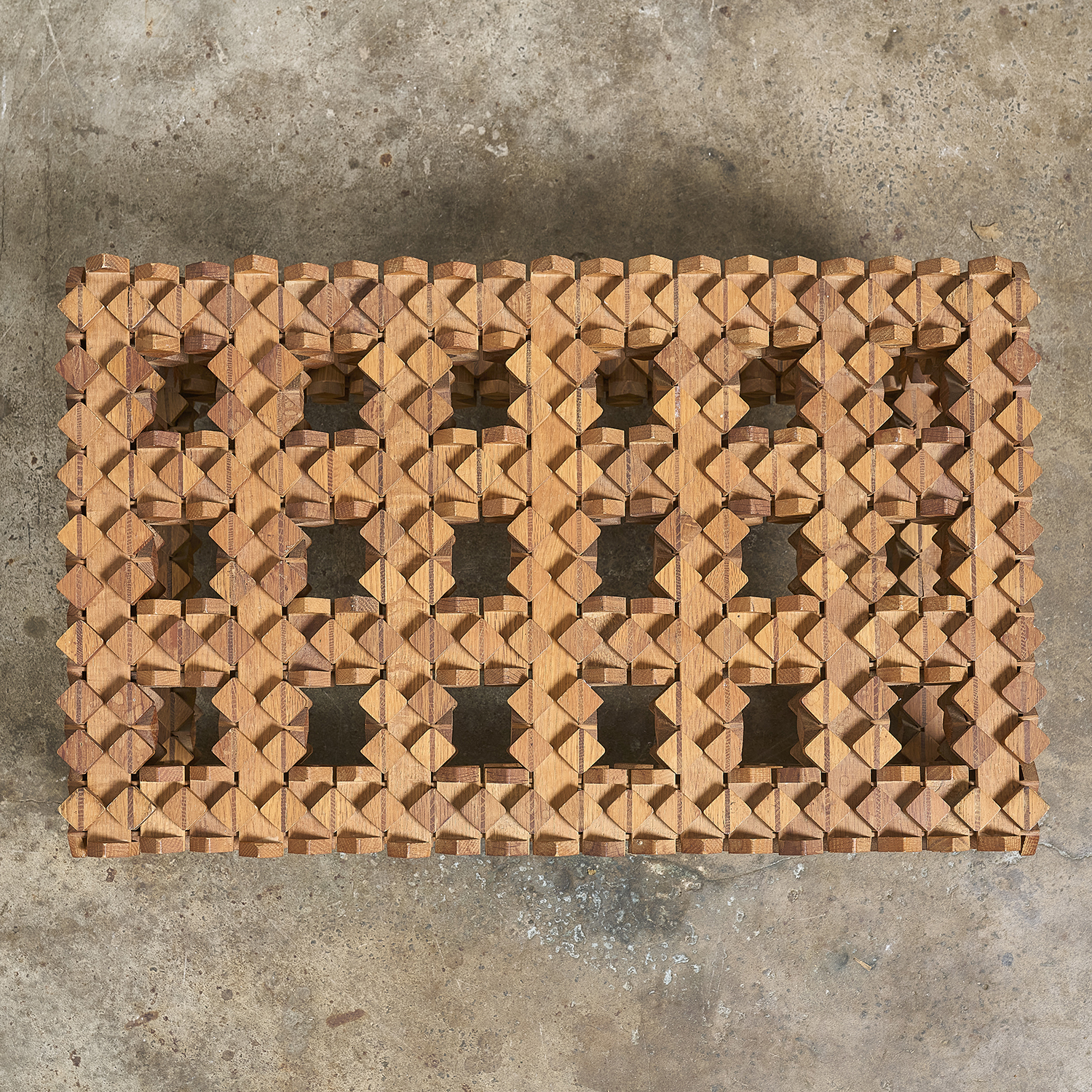 Sur le principe des casse-têtes en bois, étrange table d’appoint formée d’éléments en bois imbriquées les uns dans les autres.