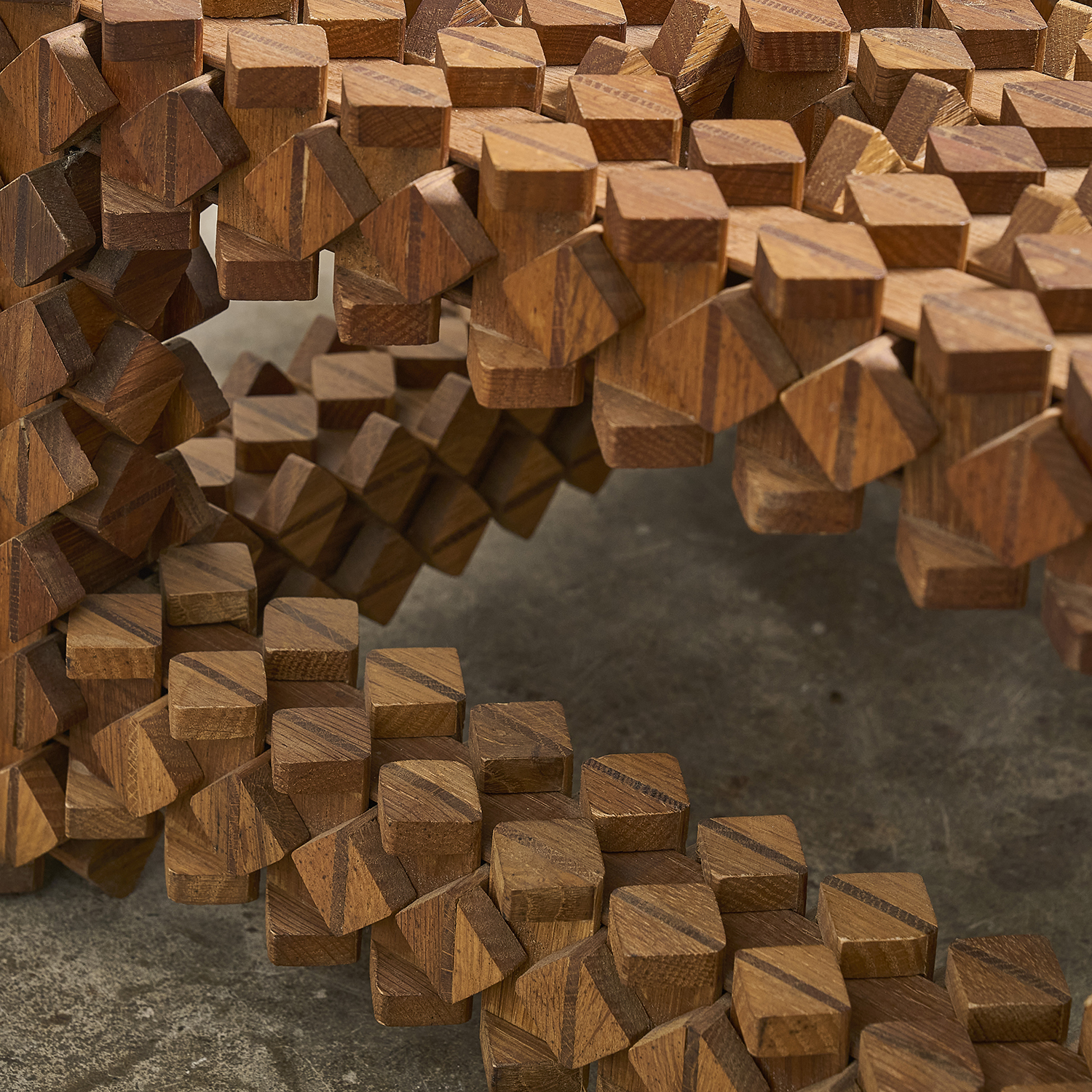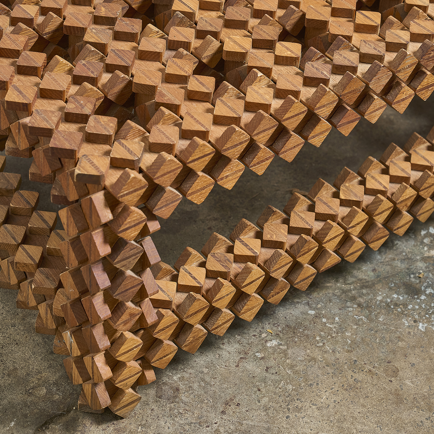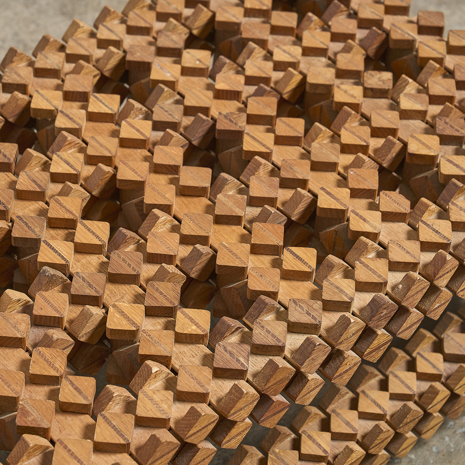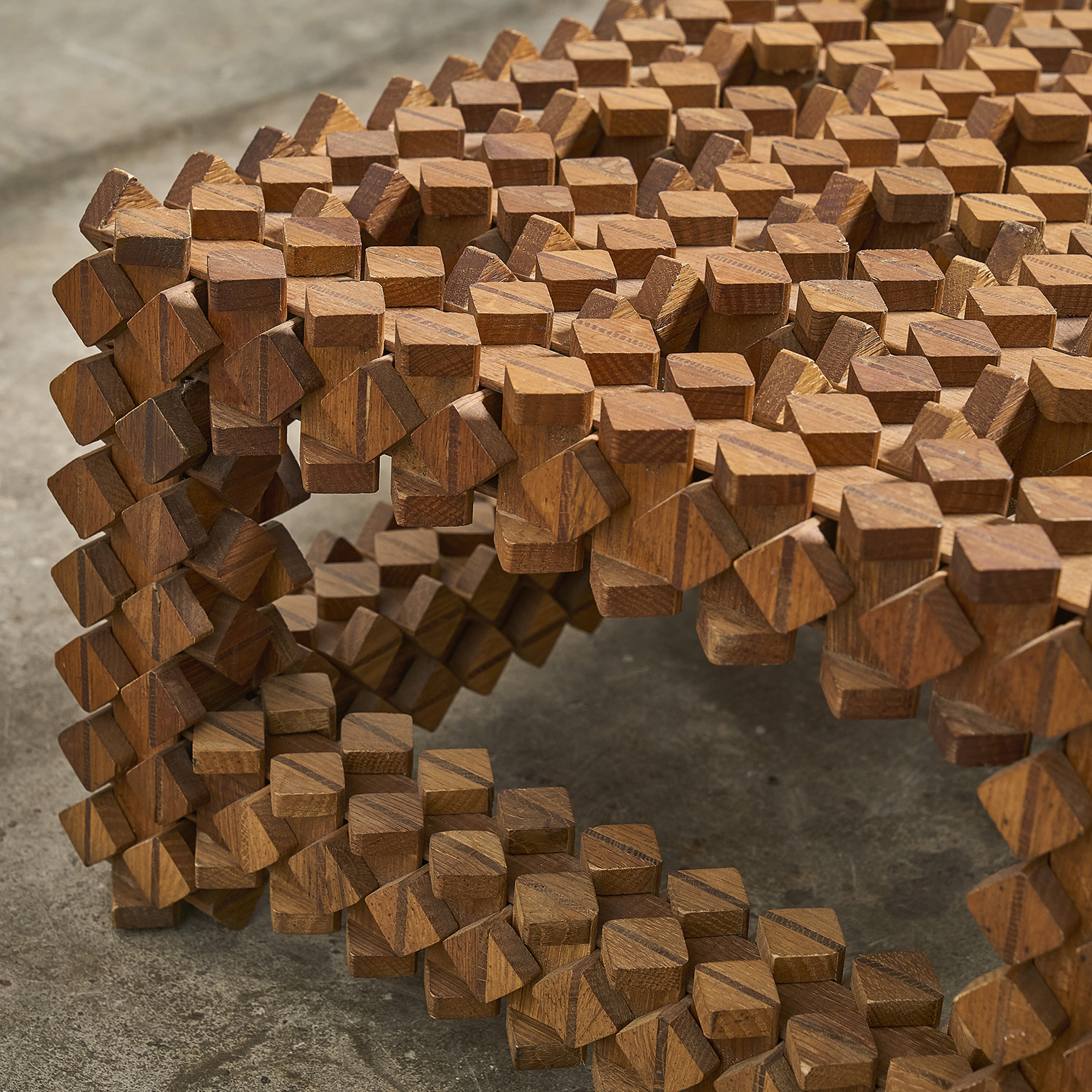 Sur le principe des casse-têtes en bois, étrange table d’appoint formée d’éléments en bois imbriquées les uns dans les autres.