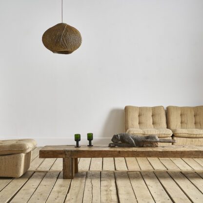 Table basse à plateau circulaire en bois de placage et chêne teinté à entretoise en X, vers 1950. H. 45 cm D. 95 cm
